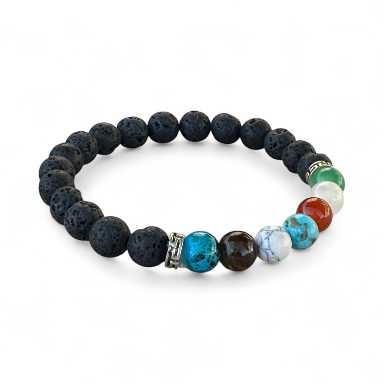 The colored agate beads add to the contrasting black lava stones. The beads are 8mm in size.