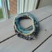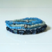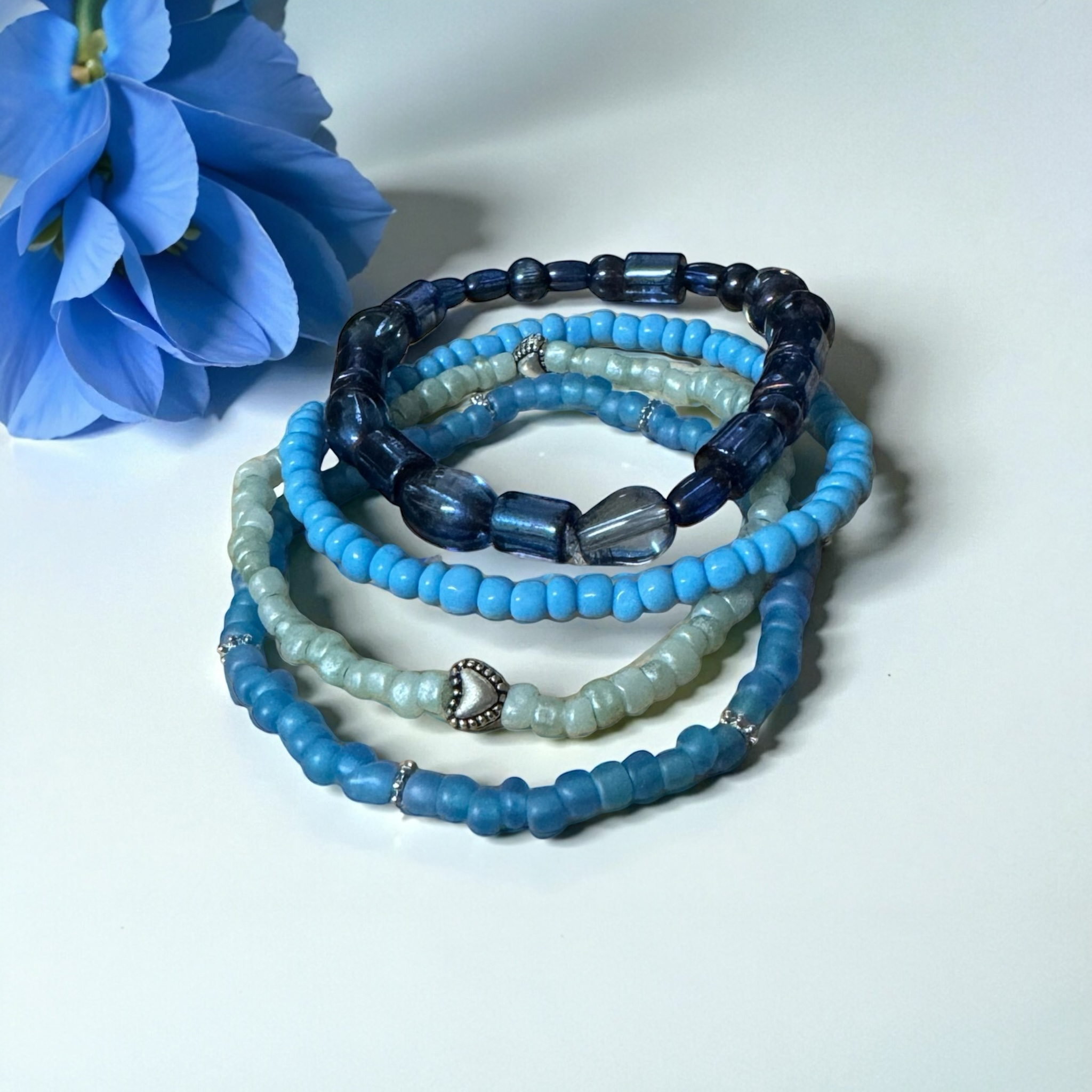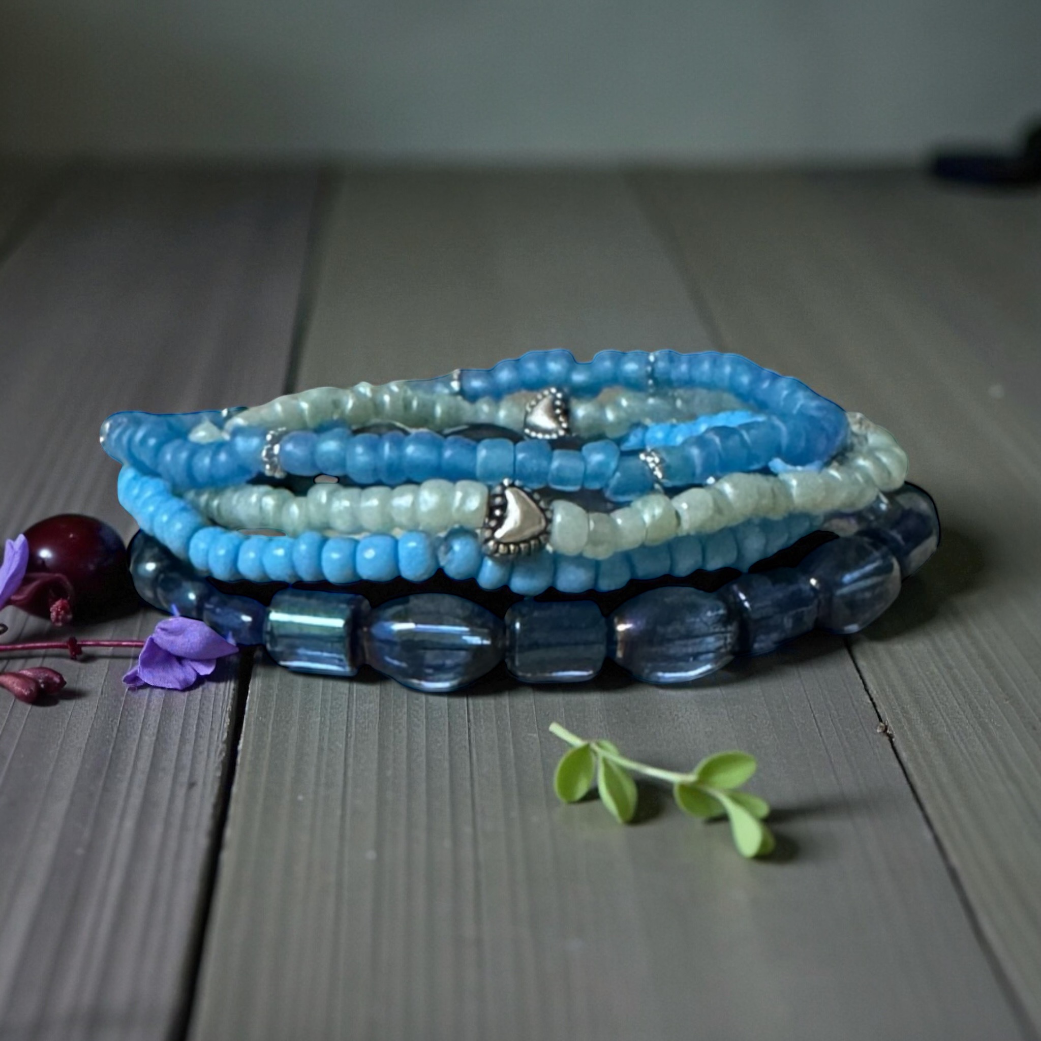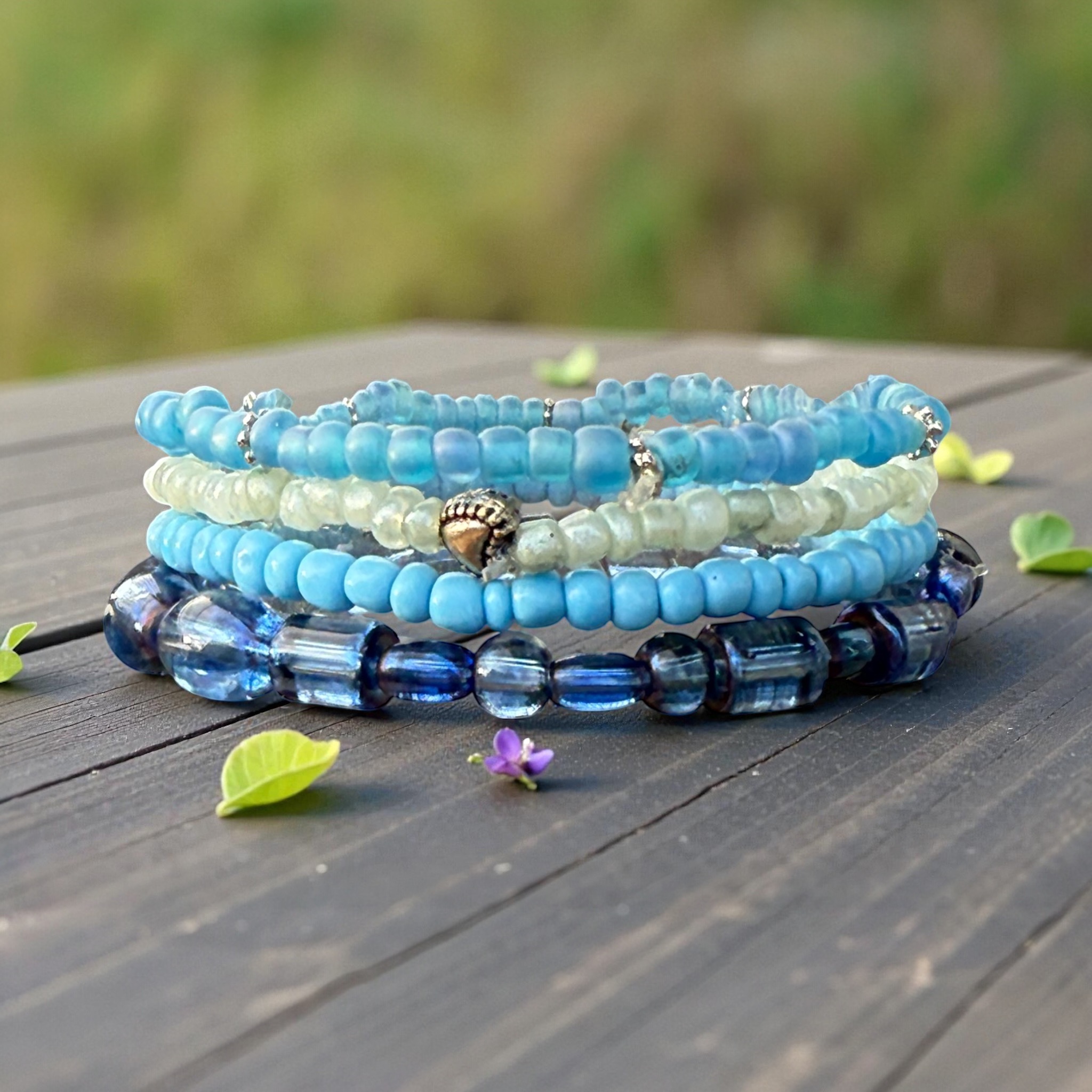 The beads measure 6/0mm seed beads and 6mm oval, tube and round translucent blue beads. I've added a metal heart charm. This is a pretty stack of a variety of shades of blue and just the right color of green.