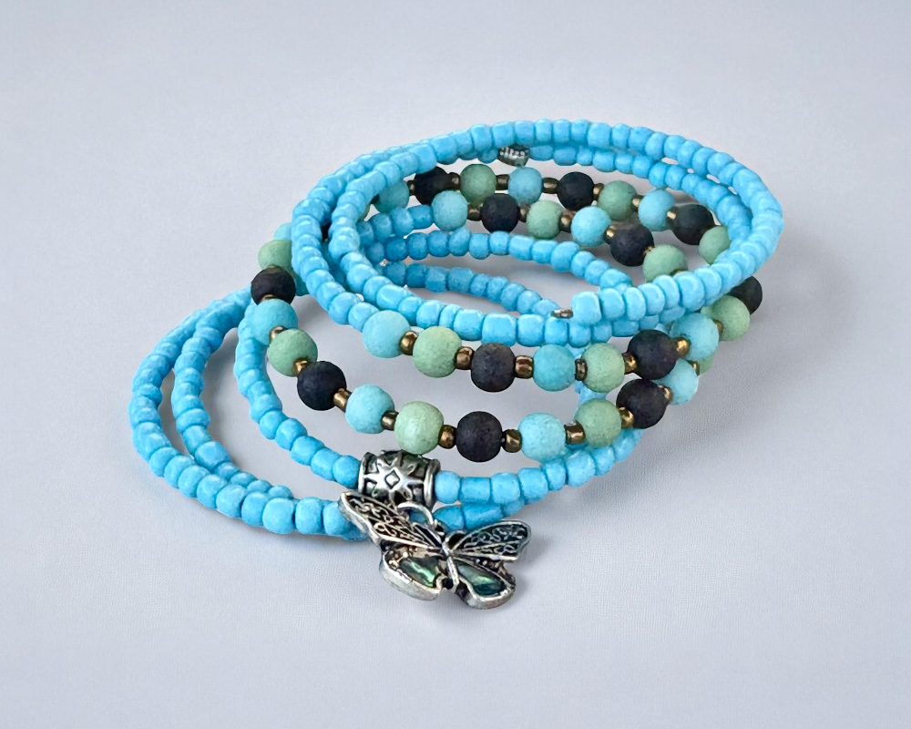 I handmade this pretty blue bracelet of four rounds of 6mm blur. green and black brads. beads and 6/0 rocaille beads on memory wire to wrap around your wrist.