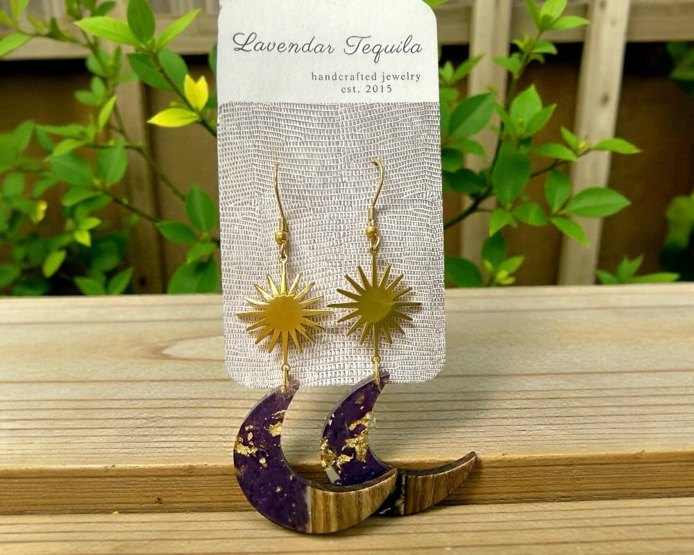 Wrapped in the allure of the moon, this walnut wood and orchid pearlescent in clear resin piece with golden foil provides a whimsical touch.