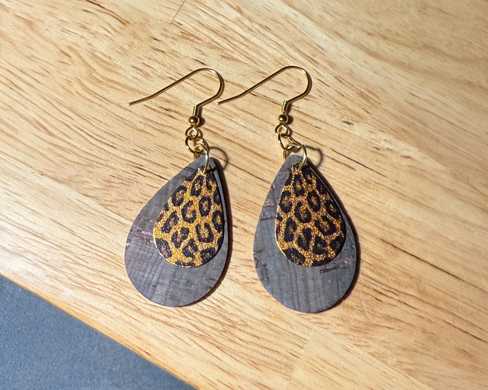This handmade pair of earrings is made of cork. The light-weight, durable cork is full of natural, earthy beauty. Cork is strong and flexible. Using cork does not kill the tree. Cork comes from bark of the cork oak tree which can regenerate after harvesting. Cork is vegan. I love the fact that cork does not involve the use of animals during production.