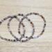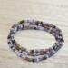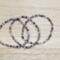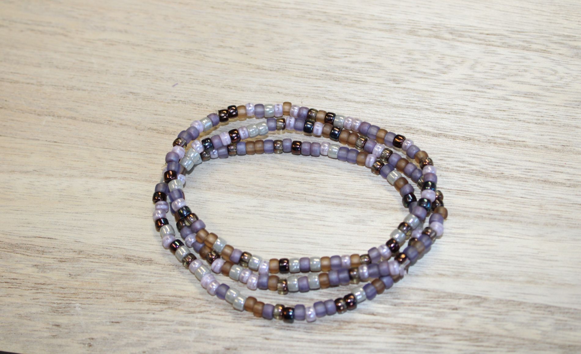 The glass beads are a mix of violet and neutral hues. 6/0 beads. The finishes are in matte semi-transparent, rainbow metallic, shiny opaque, and matte Picasso, which add to the unique look of the blend of beads. This bracelet is pretty enough on its own wearing a single bracelet or a larger stack.