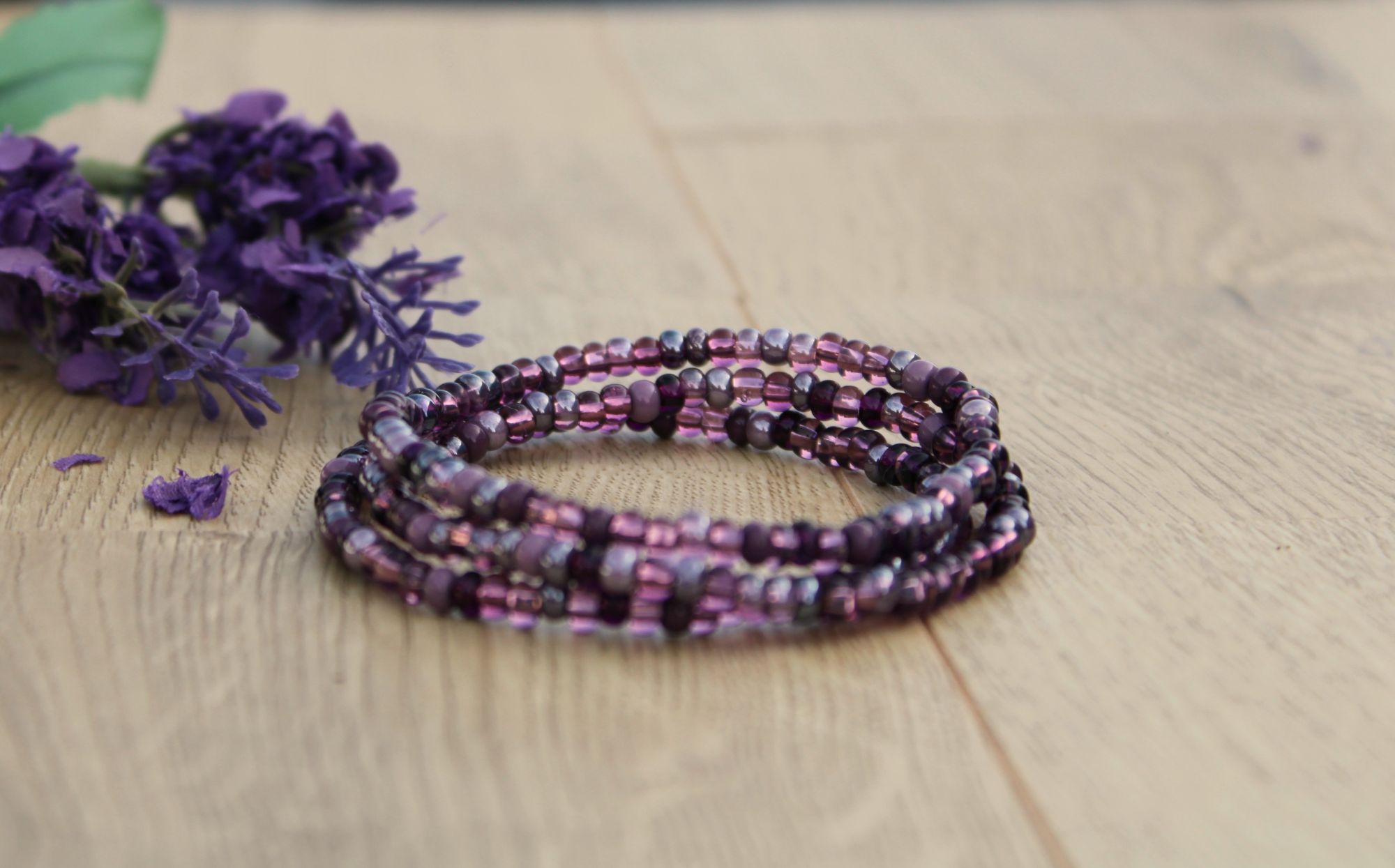 This bracelet is made of a seed bead mix of Preciosa Ornela, Czech glass. The color is a opaque and translucent multi-purple mix.
