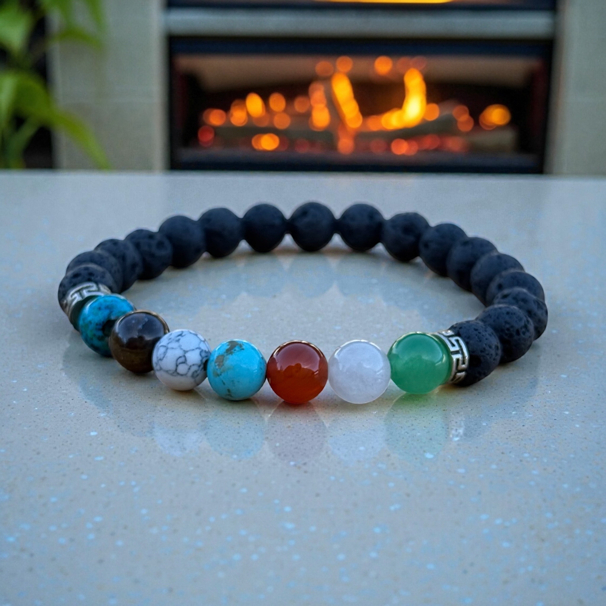The colored agate beads add to the contrasting black lava stones. The beads are 8mm in size.