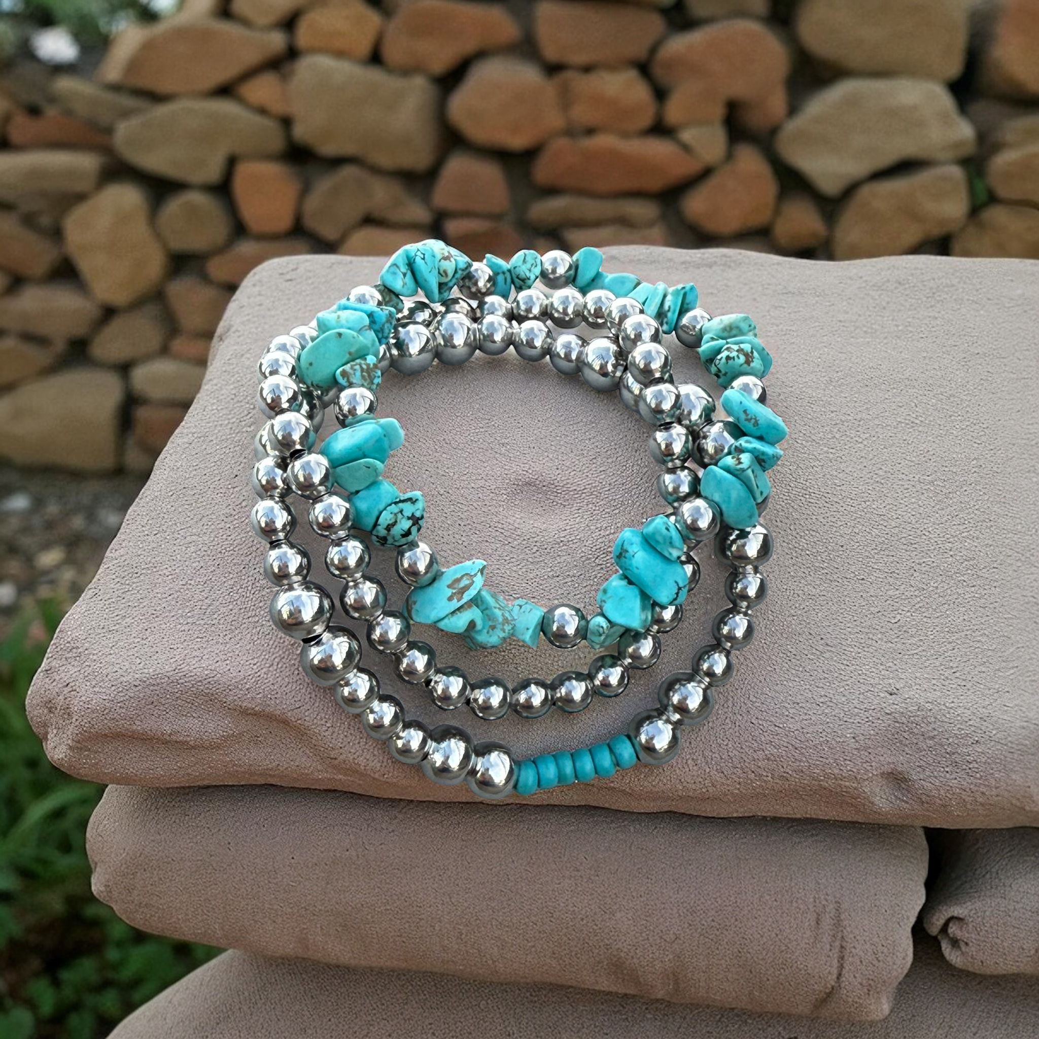 I handmade this turquoise blue stone and metal bead bracelet. The metal beads are 4mm and 3 mm in size.